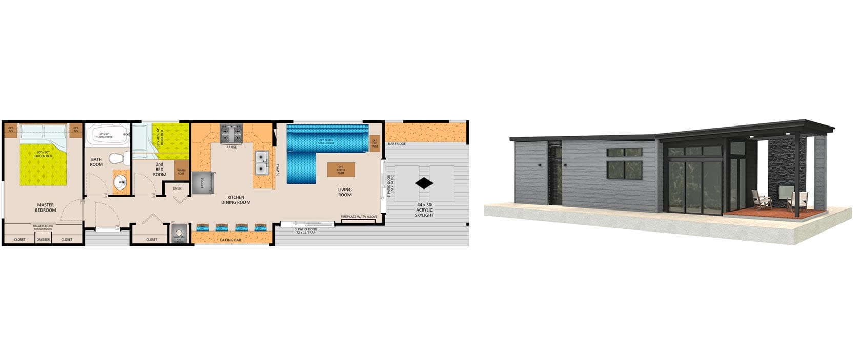 The Klondike Gold collection is exclusive to The King's Landing Resort Group Ltd. These are not your fathers small trailer. Each speaks to nature through design, comfort and unprecedented luxury. Maximizing living space in and around the park model as well exquisite views from the rooftop terraces with their clear railing systems, and optional outdoor kitchen, BBQ and Bar. Enjoy views like no others.